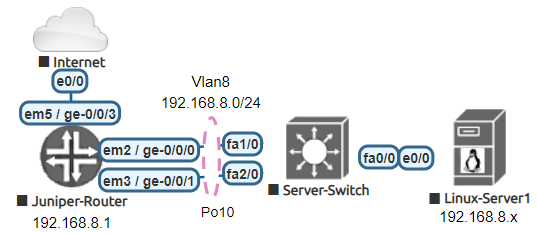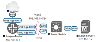 Servers will use Juniper-Router as their gateway and uplink to Internet. Server-switch have Layer 2 (access mode) connectivity to Juniper-Router. (see Fig.1)
